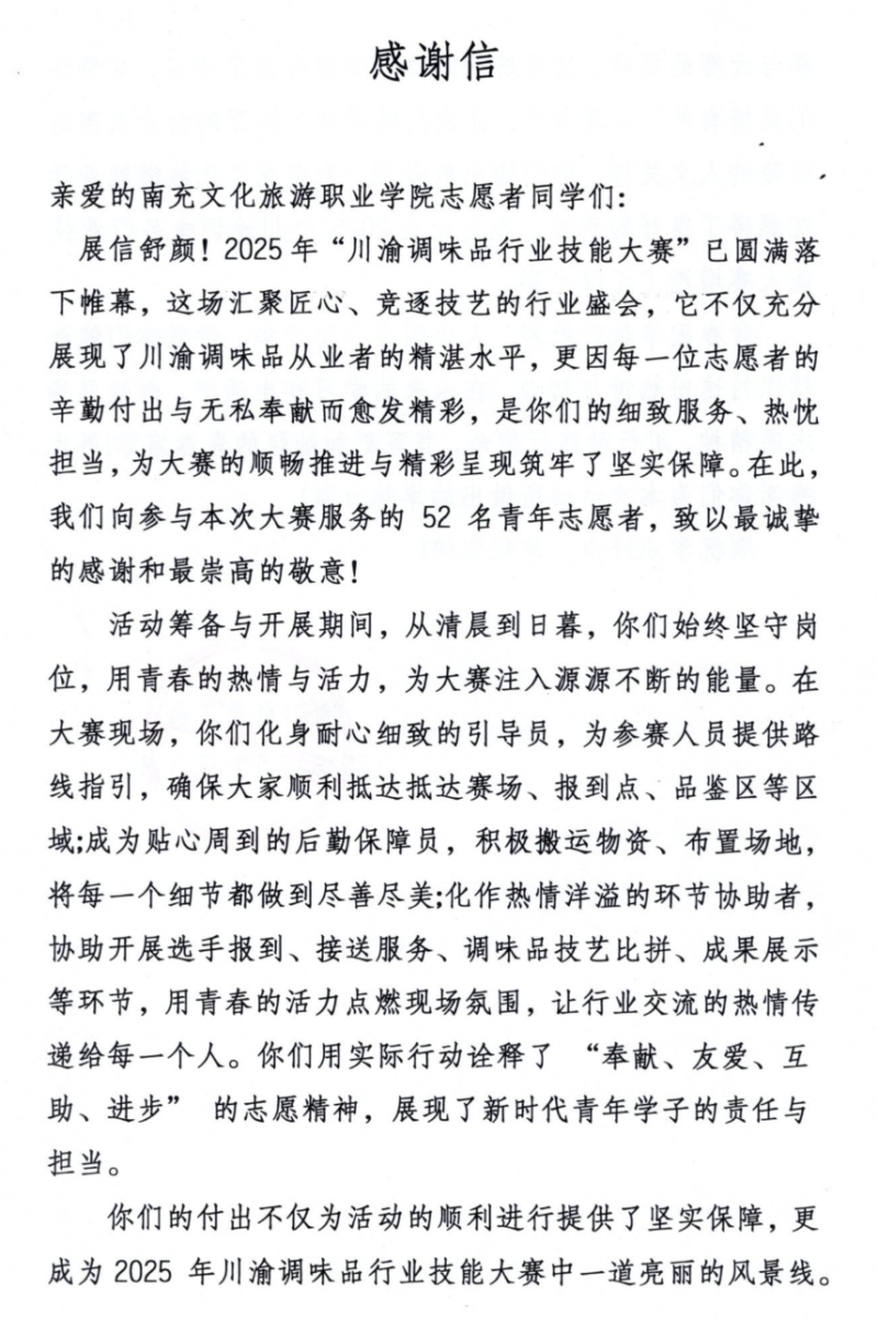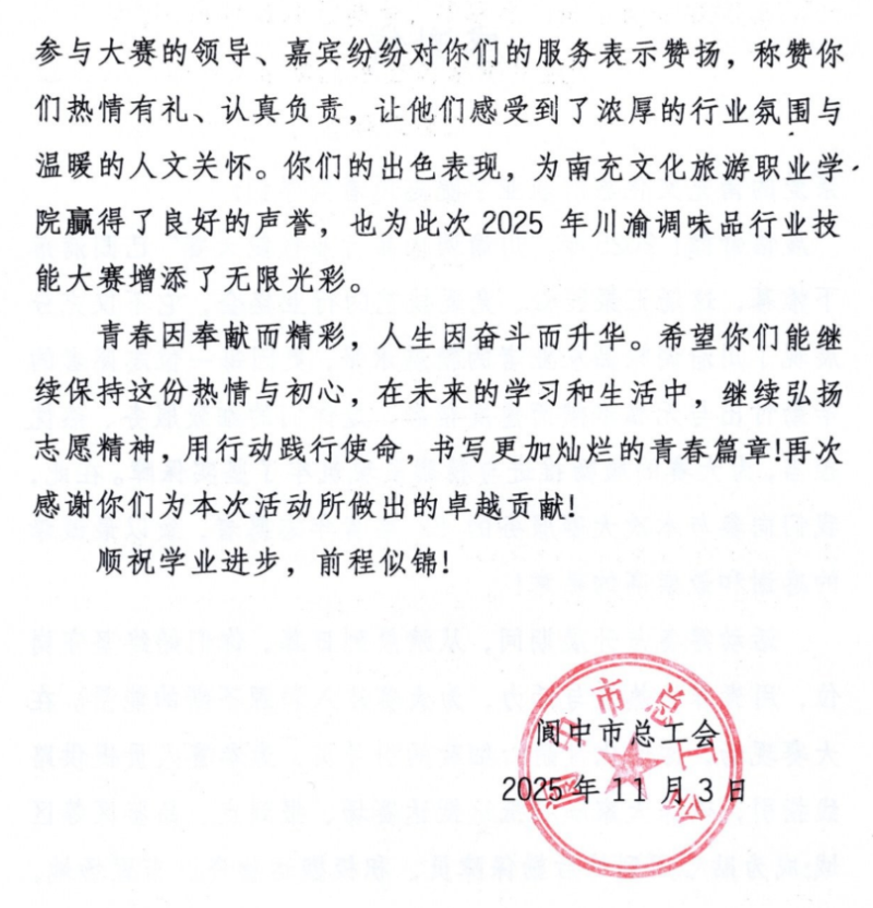 近日,由四川省总工会、重庆市总工会、南充市人民政府联合主办,南充市总工会、中共阆中市委、阆中市人民政府承办的2025年川渝调味品行业技能大赛在千年古城阆中圆满落幕。我校酒店系、文化服务系师生全程深度参与,展现了职业教育“以赛促教、以赛促学、以赛促进”的育人成果。
