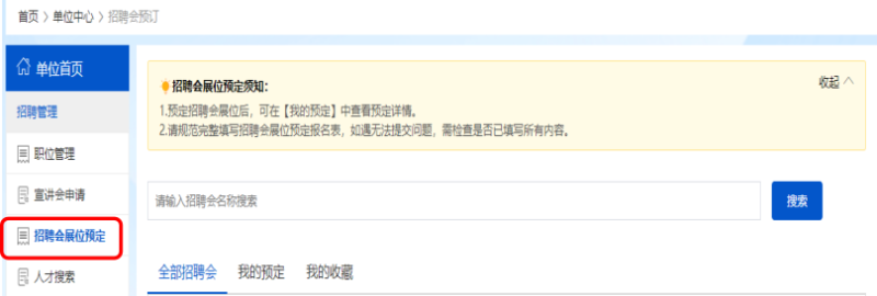用人单位点击左侧“招聘会展位预定”,在招聘会名称处输入“南充文化旅游职业学院2025年秋季双选会”,然后点击“搜索”,找到学校双选会的信息,点击“预定展位”,然后按系统要求和提示填写招聘信息、申请展位。