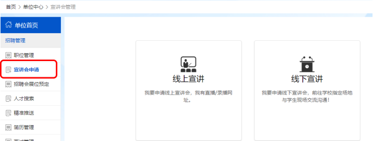 用人单位点击左侧“宣讲会申请”,然后按系统要求和提示填写招聘信息、申请宣讲会时间。