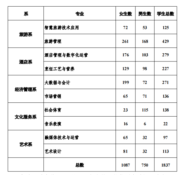 2026届毕业生涵盖旅游管理、酒店管理与数字化运营、电子商务、数字媒体艺术设计、公共文化服务与管理等21个专业及方向,共计3470人,目前在校毕业生1837人,专业及人数详见下表。