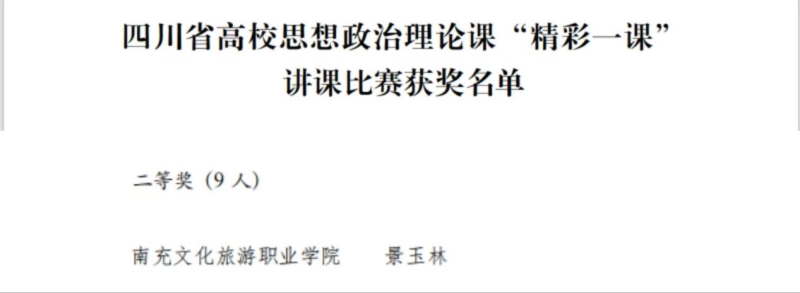 为深入学习贯彻习近平新时代中国特色社会主义思想,落实习近平总书记关于学校思政课建设的重要指示及新时代学校思政课建设推进会精神,全力提升我省高校思政课教学水平,7月20日至21日,中共四川省委教育工委、省教育厅在西华师范大学举办全省高校思想政治理论课中青年教师“精彩一课”讲课比赛决赛。经过激烈角逐,我校马克思主义学院教师景玉林荣获《思想道德与法治》课程(高职高专组)二等奖。